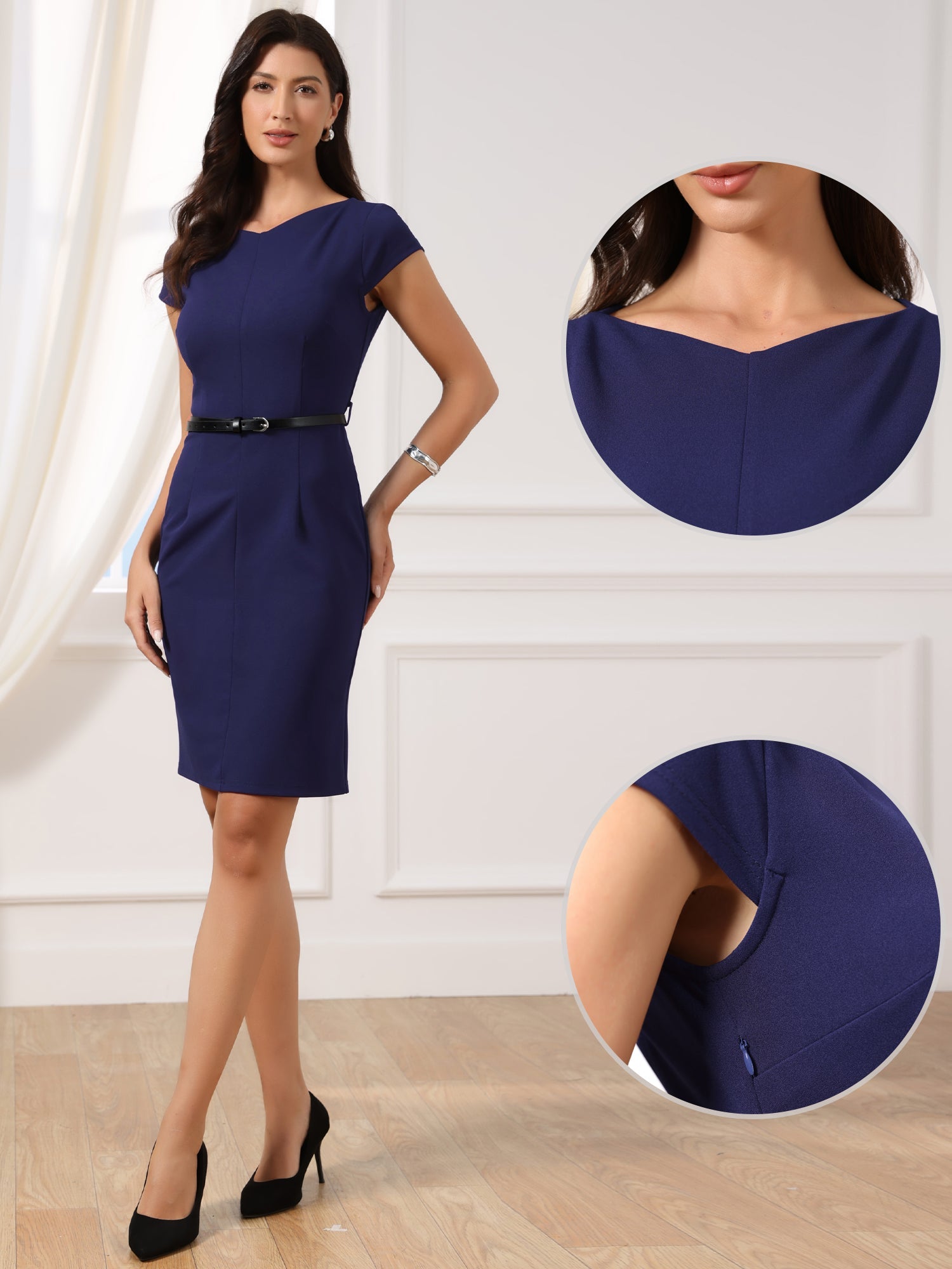 Why choose the Camille Bennett Cap Sleeve Belted Sheath Dress