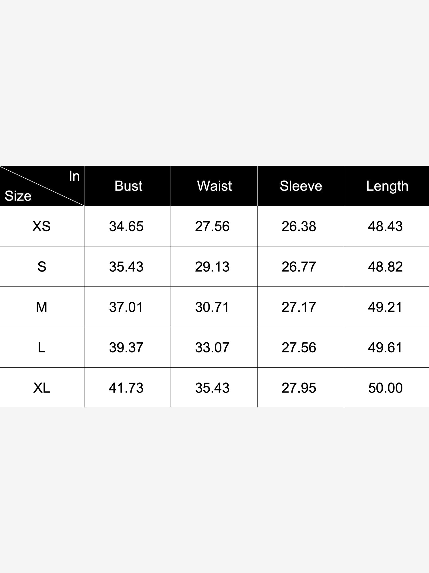 | Size | Bust | Waist | Sleeve | Length |
